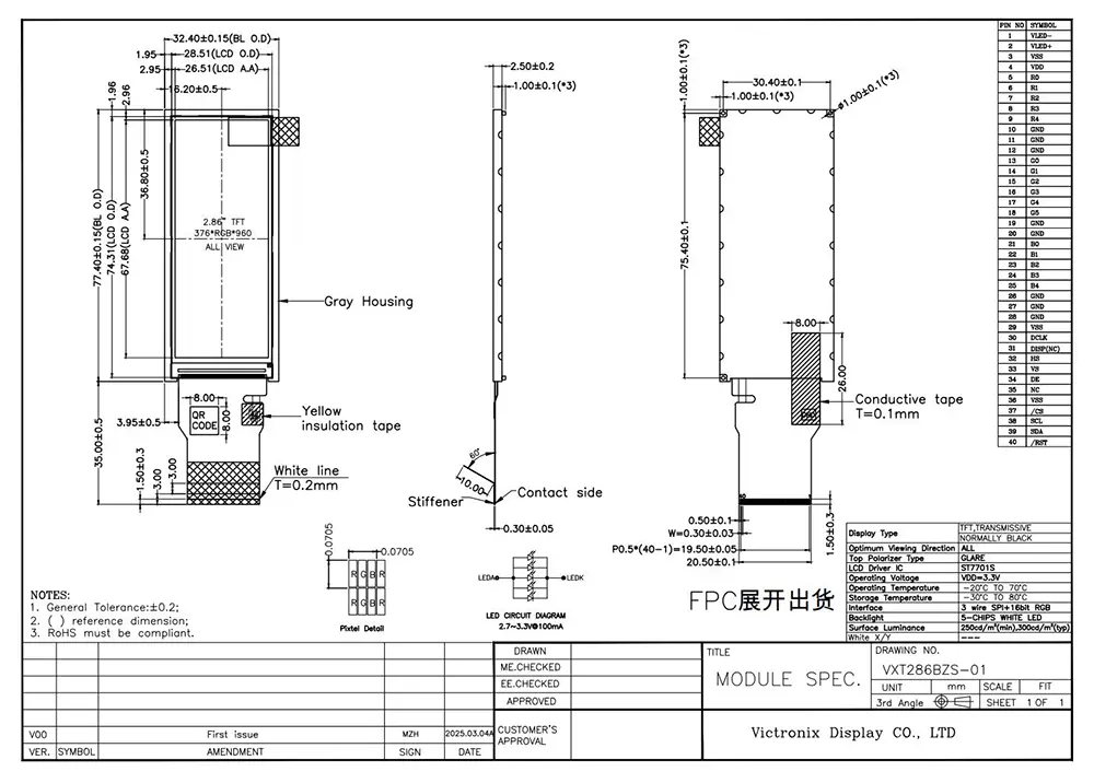 In het tijdperk van intelligentie stelt de TFT -module ons in staat om de vereiste gegevens visueel te presenteren. De kwaliteit van de TFT -module heeft een kritische impact op de toepassing ervan. Wat zijn de voordelen van de Victronix 2,86 inch 376 × 960 IPS TFT -module? In eerste instantie zorgen de helderheid van 300 CD/m², 1500: 1 contrastverhouding, een kijkhoek van 85 graden in alle richtingen en 80% uniformiteit zorgen voor levendige beelden. Ten tweede ondersteunt het een SPI+16bit RGB-interface met een ST7701S, en een 5-d-d-witte LED-achtergrondverlichting met een levensduur van 30.000 tot 50.000 uur, waardoor de bruikbaarheid op lange termijn in verschillende industriële toepassingen wordt gewaarborgd. Trouwens, het voldoet aan ROHS -normen en slaagt voor met succes rigoureuze betrouwbaarheidstests, waaronder thermische schok, vochtigheid en ESD -bescherming tot 8KV lucht en 4KV -contact. Dit product werkt efficiënt in extreme temperaturen variërend van -20 ° C tot +70 ° C en kan ernstige opslagomstandigheden van -30 ° C tot +80 ° C weerstaan.