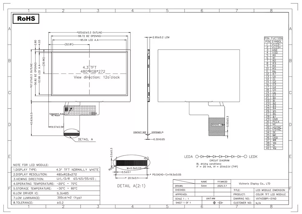 TFT LCD is een type vloeibare kristalweergave dat gebruik maakt van dunne-film transistortechnologie om de beeldkwaliteit te verbeteren, en het heeft talloze toepassingen in het dagelijks leven. Wat maakt de Victronix 4,3 inch 480 × 272 industriële TFT -module als professionele TFT -module -fabrikant en leverancier in China anders anders dan andere fabrikanten? Ten eerste biedt het een typische helderheid van 300cd/m², een brede kijkhoek van 65 ° in de richting van 12 uur en een contrastverhouding van 700: 1, waardoor uitstekende leesbaarheid vanuit verschillende invalshoeken zorgt. Ten tweede integreert het een achtergrondverlichtingseenheid met 7S1P-witte LED's met een typische levensduur van 30.000 tot 50.000 uur (tot 50% initiële helderheid), waardoor een duidelijke zichtbaarheid in alle verlichtingsomstandigheden wordt gewaarborgd. Bovendien ondersteunt het een RGB -interface met de ILI6485 -controller. Bovendien passeert het rigoureuze omgevingstests, inclusief thermische schok (-30 ° C ↔ +80 ° C-cycli), opslag van vochtigheid (60 ° C/90% RH) en mechanische vibratie, waardoor het naadloos kan werken over een verlengd temperatuurbereik (-20 ° C tot +70 ° C).
